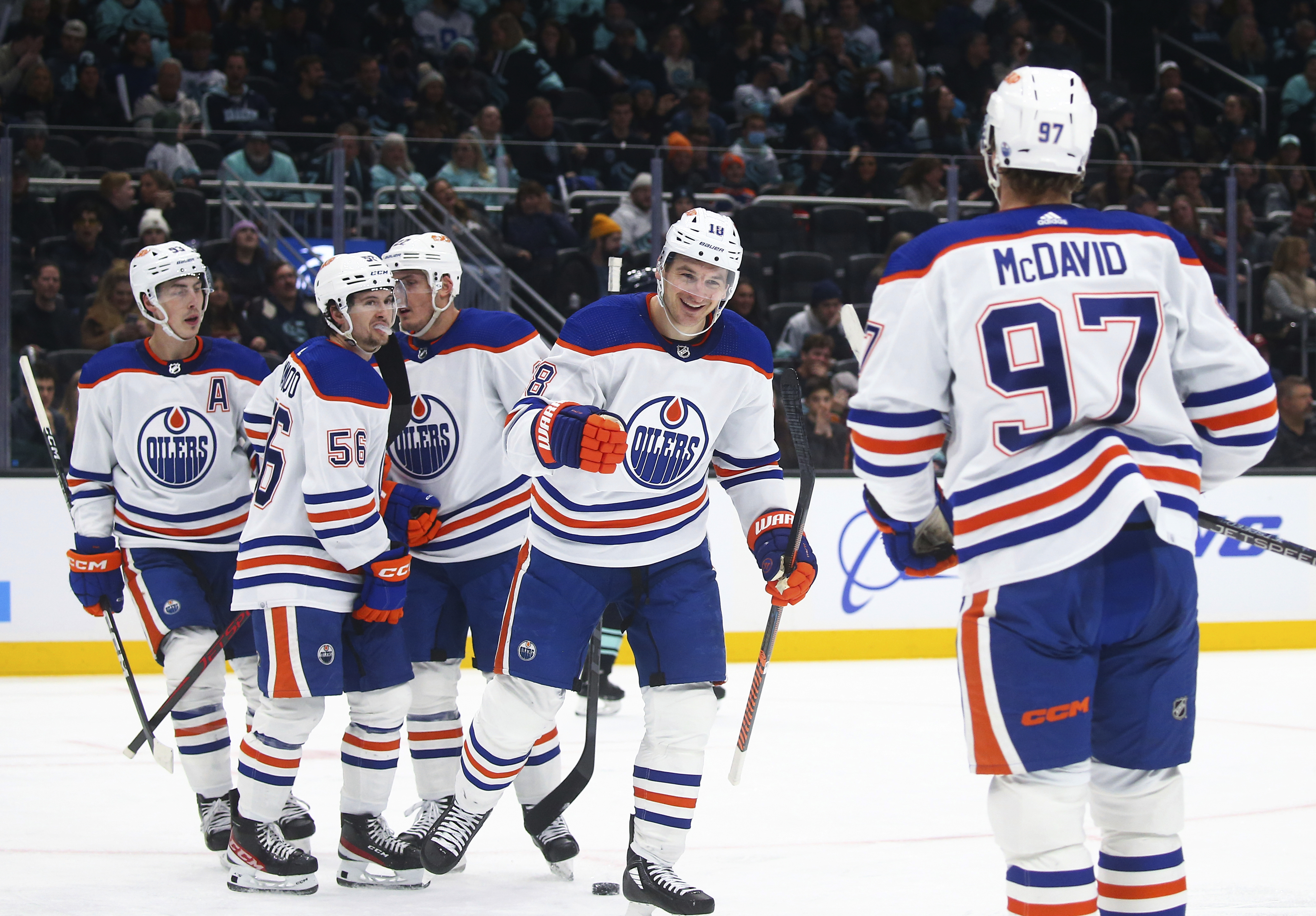 Zach Hyman tapped in a power-play feed from McDavid. Klim Kostin put a backhand under the crossbar and in. Darnell Nurse beat Philipp Grubauer blocker side, chasing the Seattle goalie from the game after allowing three goals on five shots. Jesse Puljujarvi beat new keeper Martin Jones at the halfway point of the first to make it 4-0.
