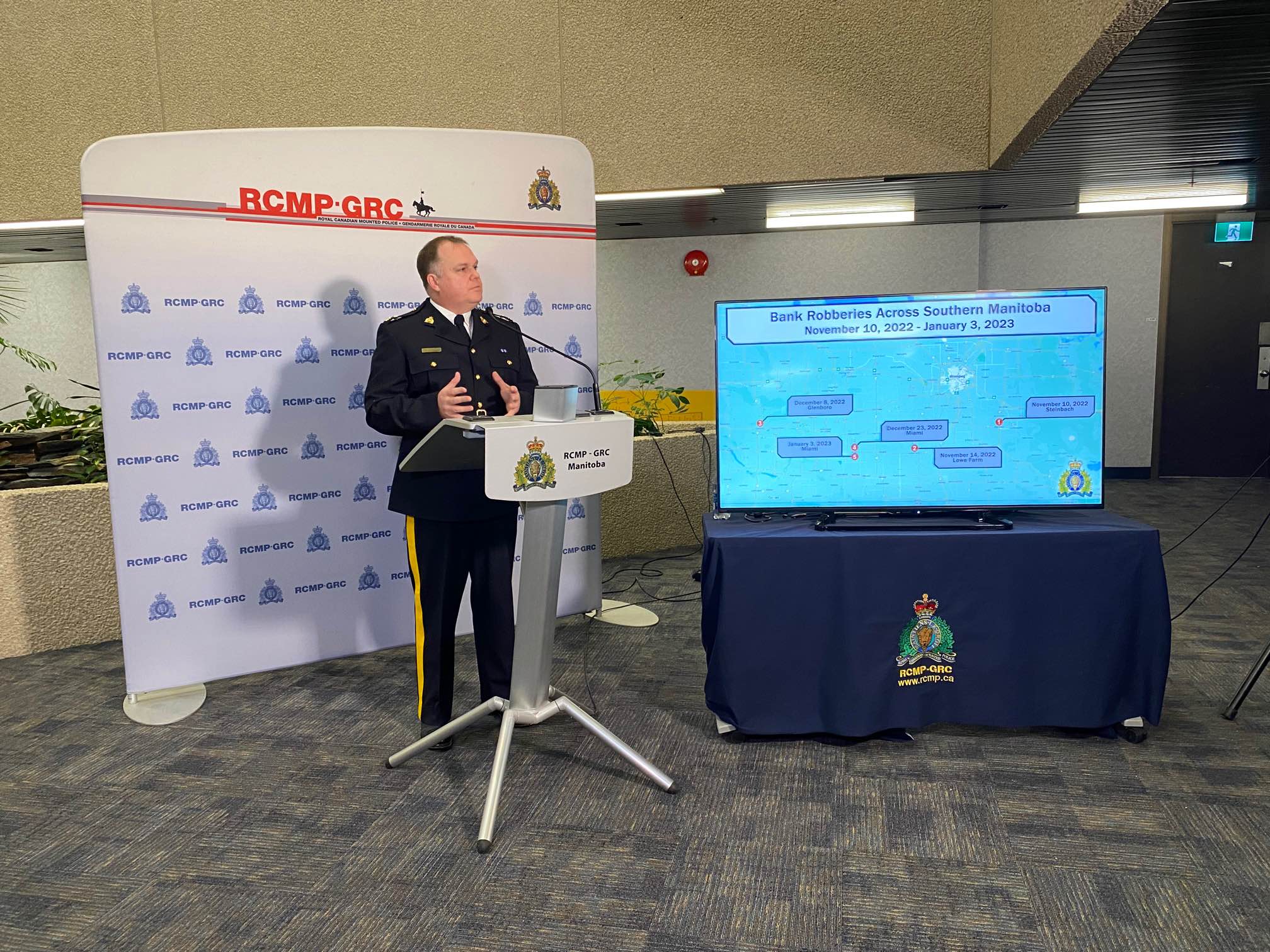 Police say thousands of dollars were stolen in five separate robberies at financial institutions in Steinbach, Lowe Farm, Glenboro, and Miami between Nov. 10 and Jan. 3.