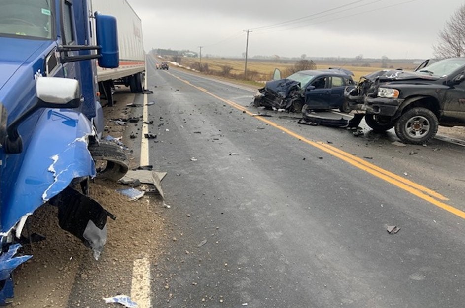 On Thursday, Jan. 12, at 12:53 p.m., emergency responders were called to Huron Road for a report of a three-vehicle collision involving a car, a pick-up truck and a transport truck. OPP West Region / Twitter