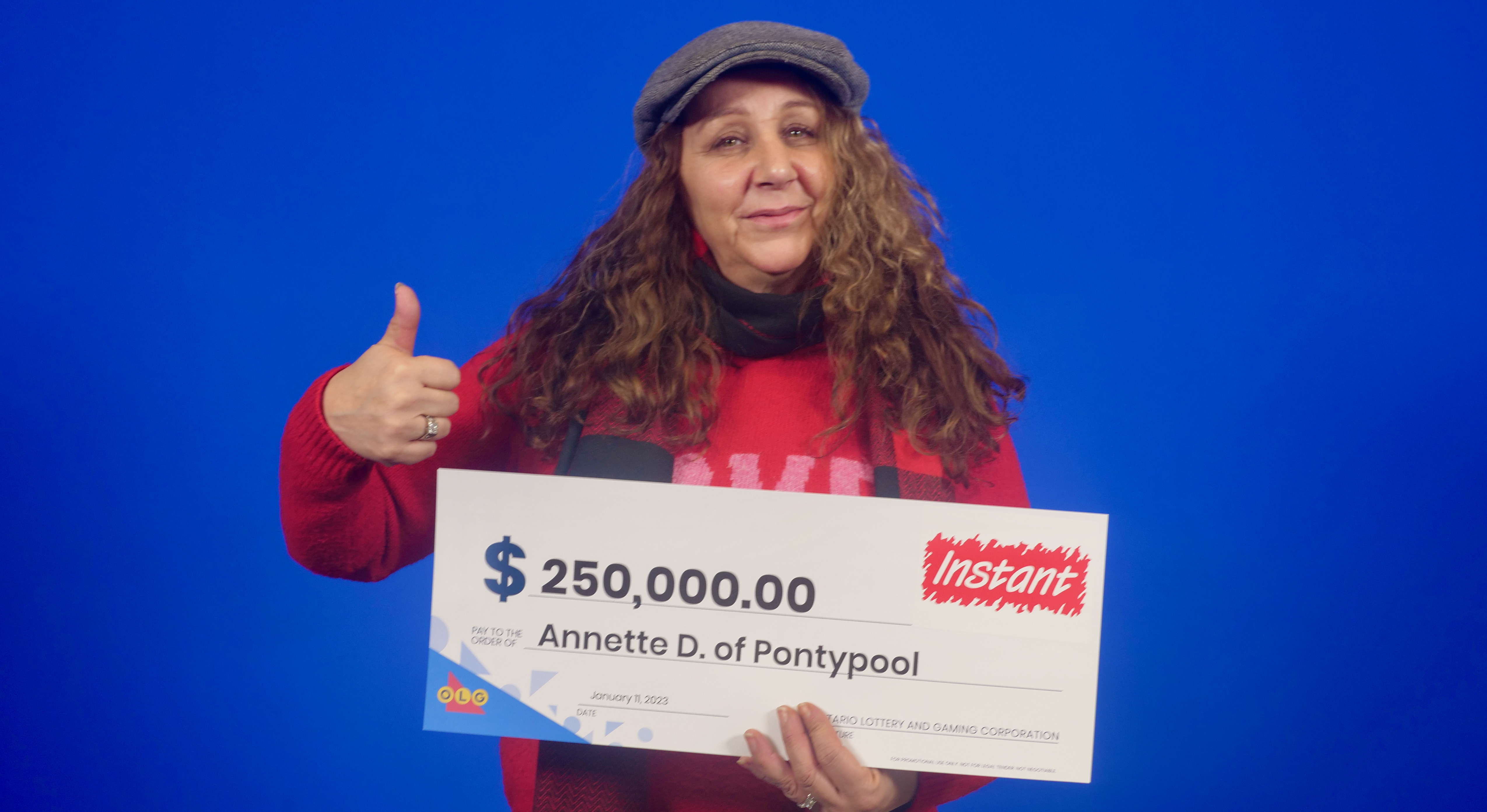 OLG said Friday Annette Dukic, 54, won the top prize of $250,000 on an Instant Jackpot lottery ticket which she purchased at Corner Convenience on John Street in Pontypool, in the City of Kawartha Lakes.