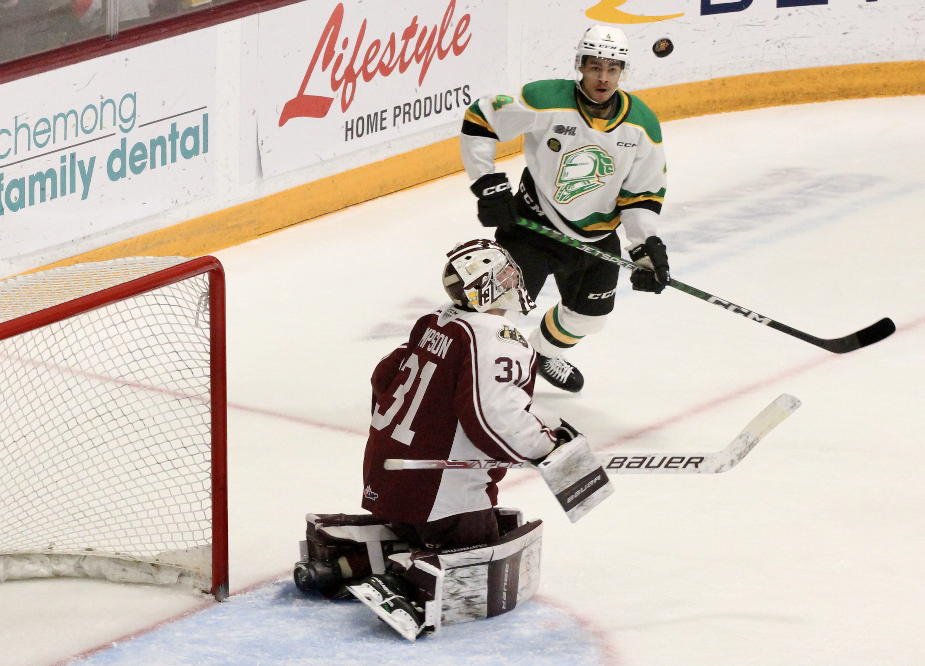 Brett Brochu came up big in the London net several times. He made two breakaway saves and stoned Seattle Kraken draft pick at the side of Knight net with his left pad.