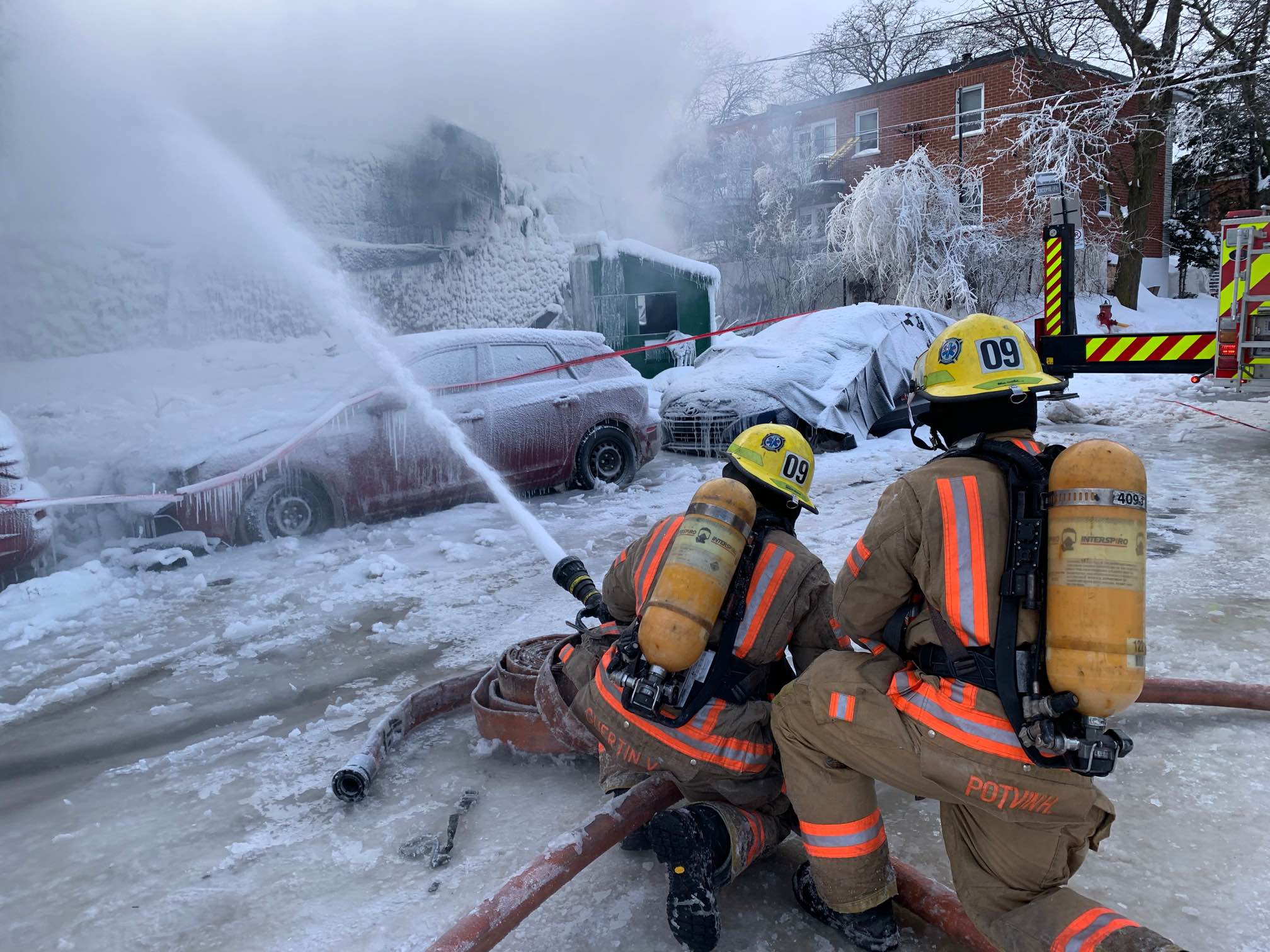 The frigid weather conditions made it difficult for the 150 firefighters at the scene in the Mercier-Hochelaga-Maisonneuve borough. Their jackets were covered in ice and some of their equipment froze as the fire went on for hours.