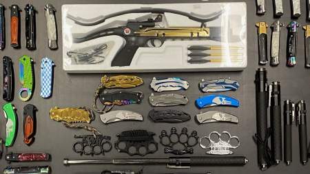 Investigators say around 20 pairs of brass knuckles, 50 flick knives (switchblades), a half dozen telescopic batons and a single-handed crossbow were on display for sale at the Appleby line Big Bear at New Street.
