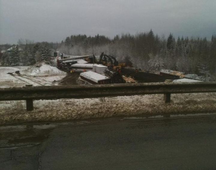 CN Spokesperson Patrick Waldron said 12 cars were carrying lumber, and the one car carrying sulphur dioxide was sitting upright and not leaking after the derailment.
