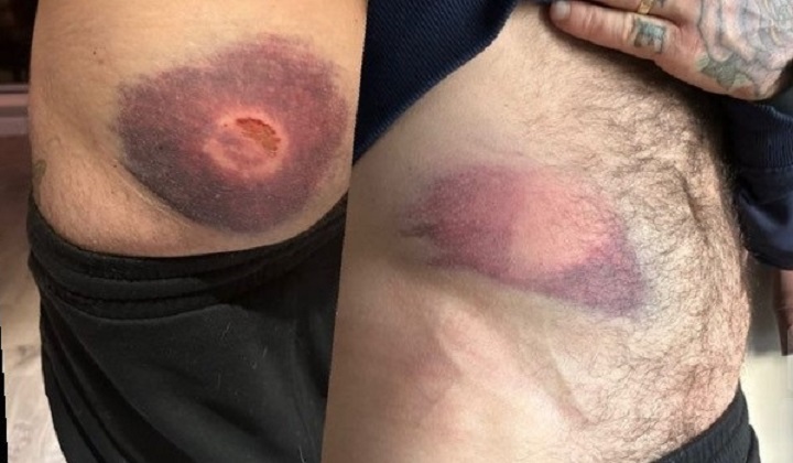 “The next thing I know I’m on the ground, thought I’d been hit by a car first, and realized I was being swarmed by police and K-9 units, I’d been shot twice with nonlethal rounds in the gut and the butt, but they were beating at me and ripping at my clothes, questioning where my girlfriend was and why I’d covered up my tattoos,” he said.