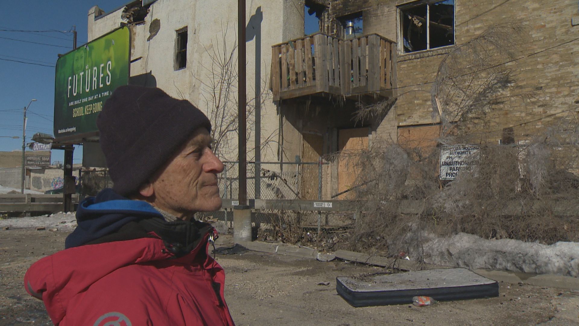 Bits of charred debris are strewn around the badly damaged building and it has been declared a complete loss, which is just one of many losses for the community of Point Douglas.