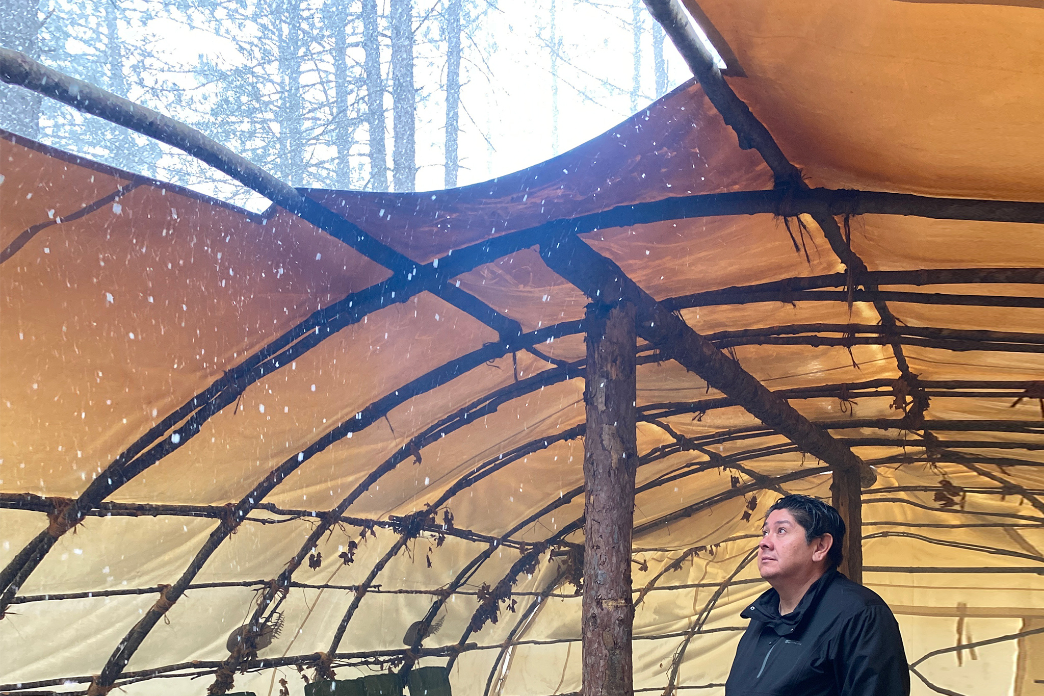 Inside the lodge, a gentle dusting of snow from an advancing cold front drifts through a square cut-out air vent in the canvas ceiling, falling onto a fire below.