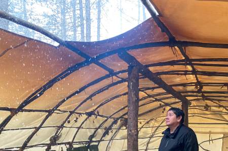 Nestled among the towering pines of Batchewana First Nation is Nogdawindamin’s teaching lodge, snow camouflaging its white canvas roof, which sits low to the ground.