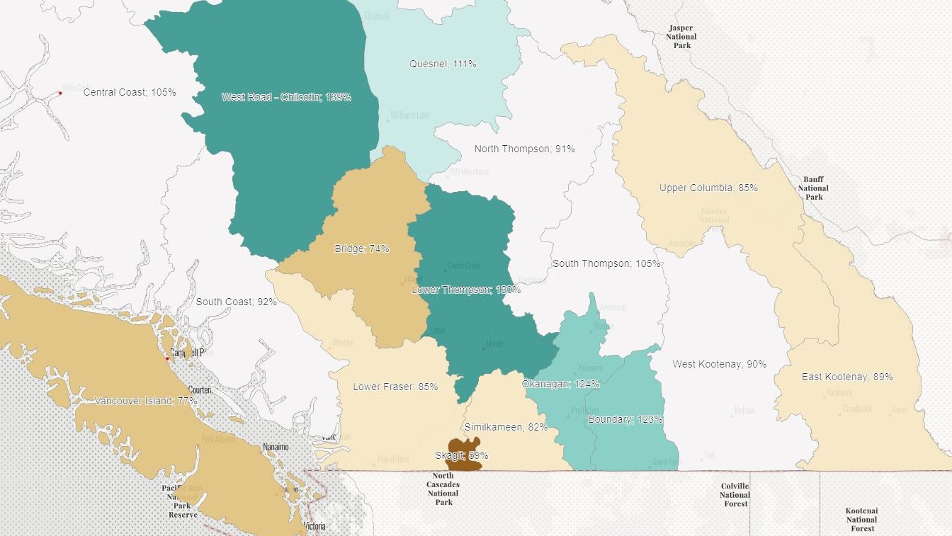 Elsewhere, the latest update said the surrounding regions of West Kootenay (90 per cent), Similkameen (82 per cent) and Skagit (59 per cent) had below-normal levels.