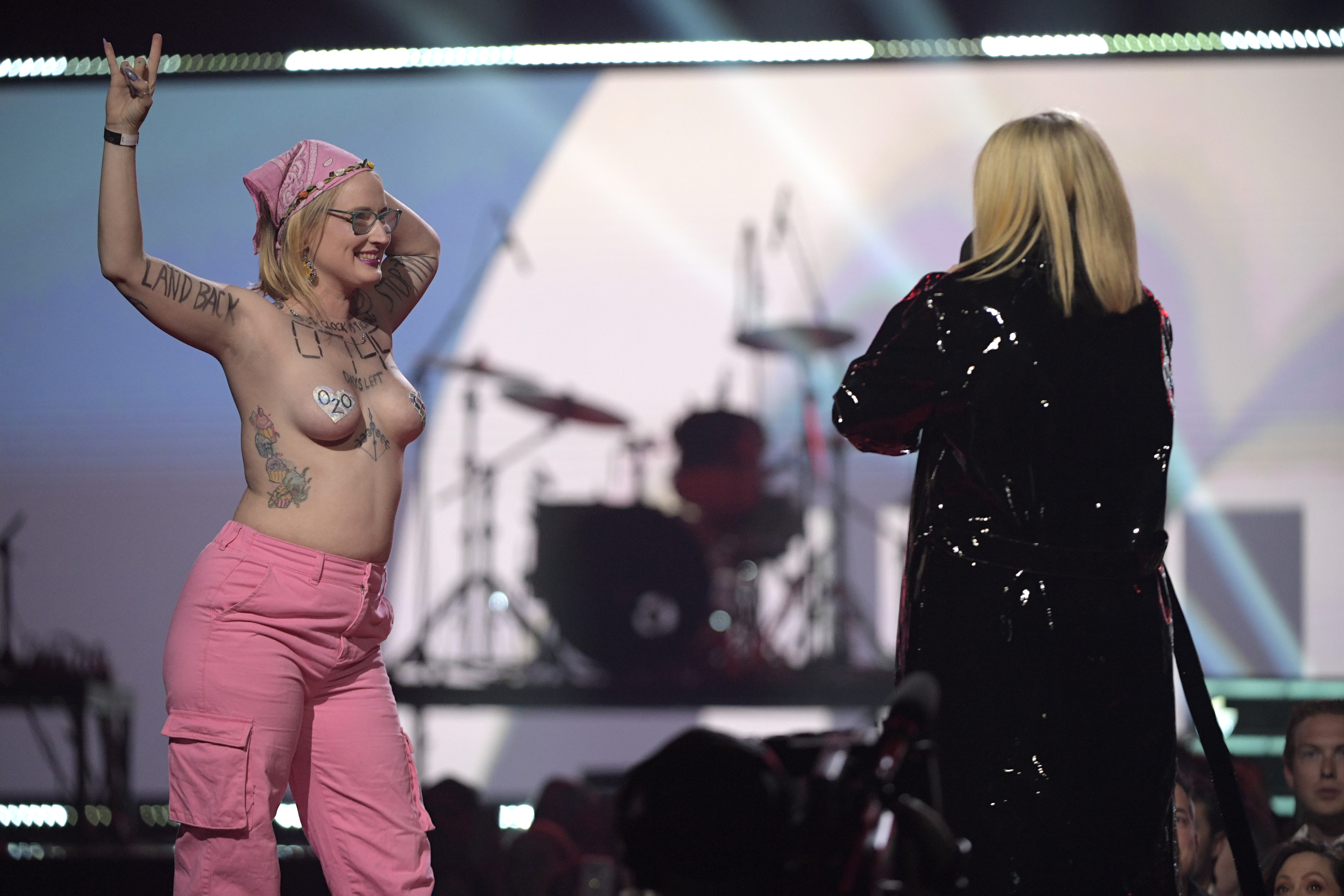 The woman who went on stage topless at the Juno Awards in Edmonton on Monday said she did it to bring attention to the loss of natural carbon-capturing areas across Canada.