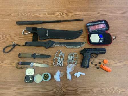 As a result of the investigation, officers located and seized a number of drugs and prohibited weapons.