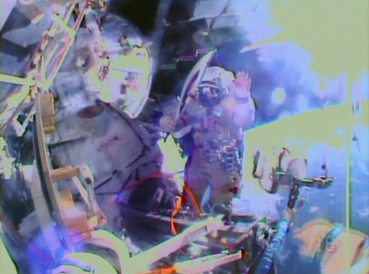 NASA Live TV showed Russian cosmonauts Oleg Kotov and Sergei Ryazanskiy carrying the unlit Olympic torch, bobbing weightlessly at the end of a tether in a darkness dotted by stars, outside the International Space Station on Saturday.