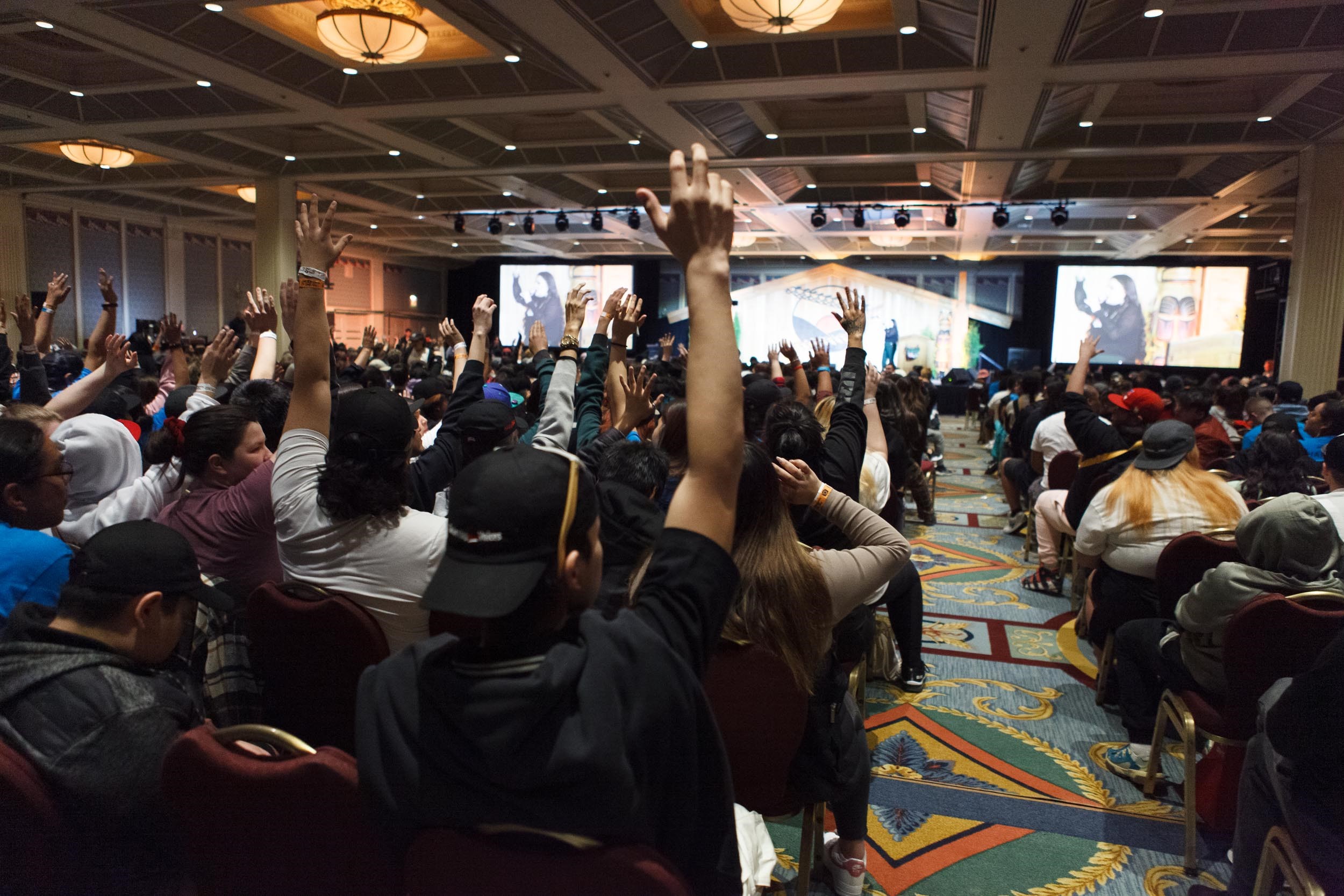 The British Columbia ballroom at the Fairmont Hotel Vancouver – which can host up to 1,500 people – was almost at capacity as Indigenous youth grabbed their seats, welcomed in by Dj Kookum for the start of Gathering Our Voices (GOV).