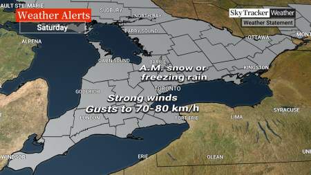 Freezing rain and strong winds are possible Saturday morning for Hamilton, Ont. and municipalities in Niagara Region, according to a statement from Environment Canada.