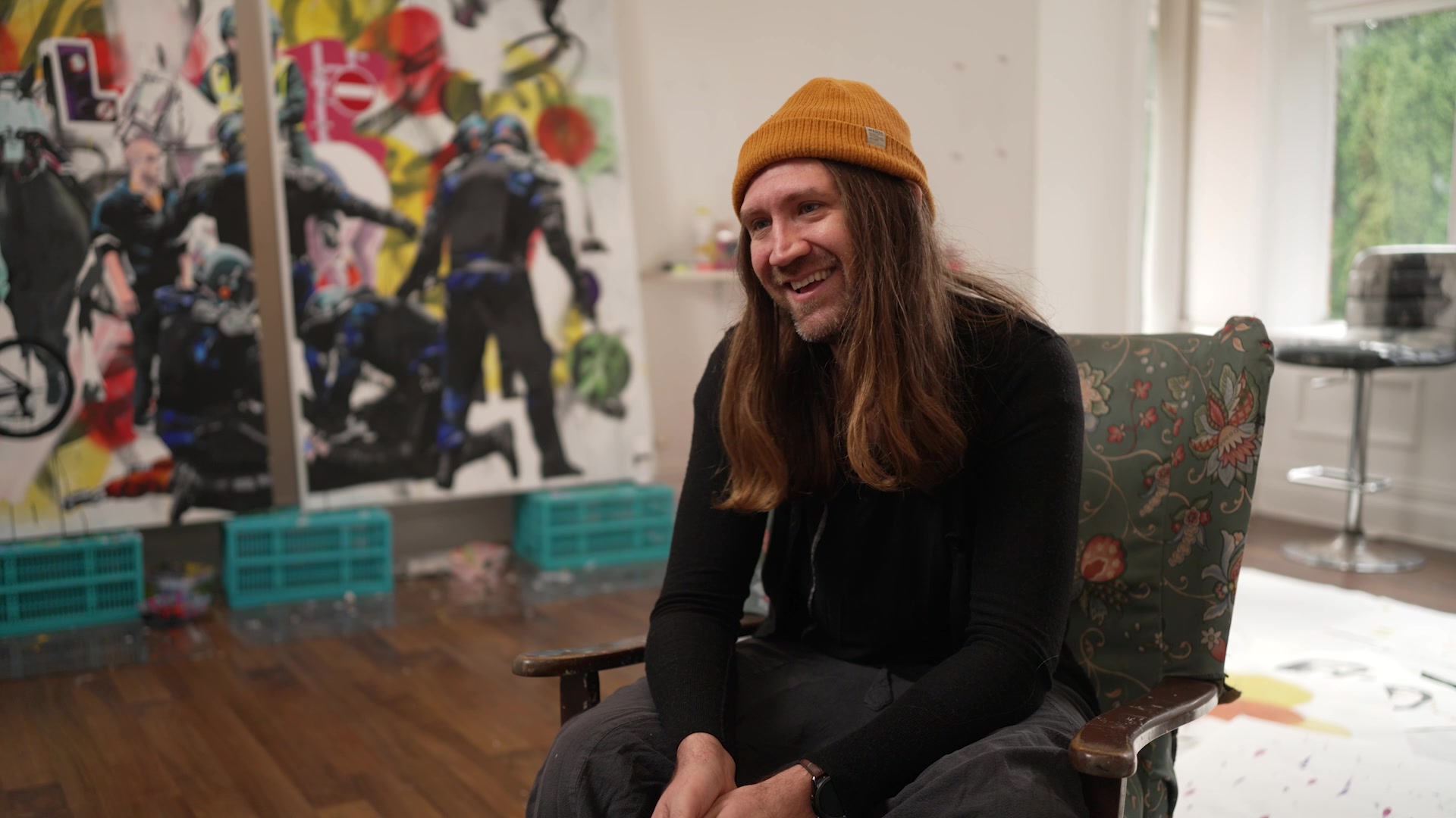 The man himself bustles around with a giddy sort of energy, clad in furry animal slippers, with long hair and perpetually paint-stained fingers, a visual reminder of his love affair with colour.
