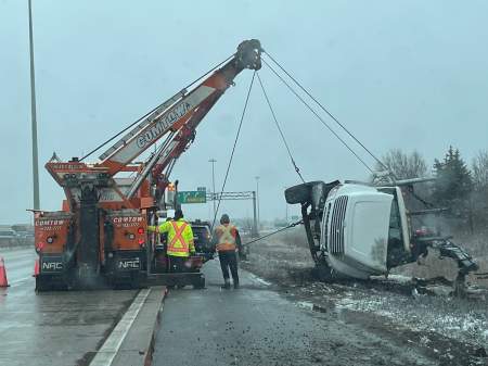 Officers said the flatbed crane truck rolled over into the right side ditch.