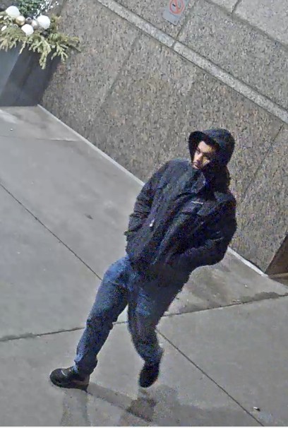 He was seen wearing a black winter jacket, blue jeans and black and white shoes.