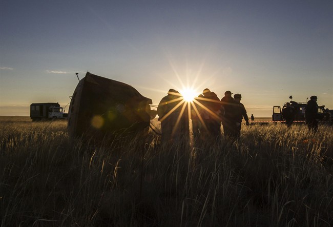 MOSCOW – A Russian space capsule carrying the Sochi Olympic torch and three astronauts returned to Earth on Monday from the International Space Station in a flawless landing on the steppes of Kazakhstan.