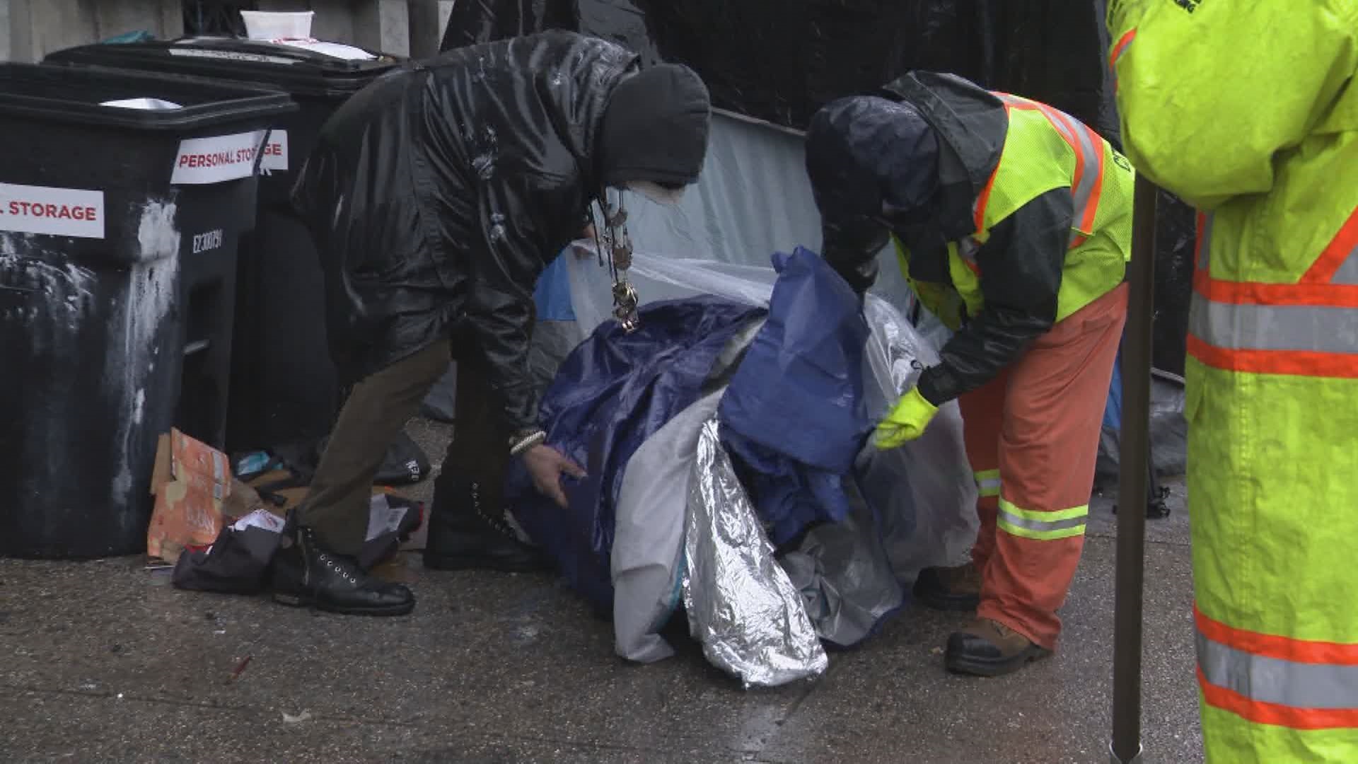 During the pouring rain, not everyone was willing to immediately pack up and move, and on Saturday, workers were greeted with swearing and verbal abuse from one man sheltering in a makeshift home.