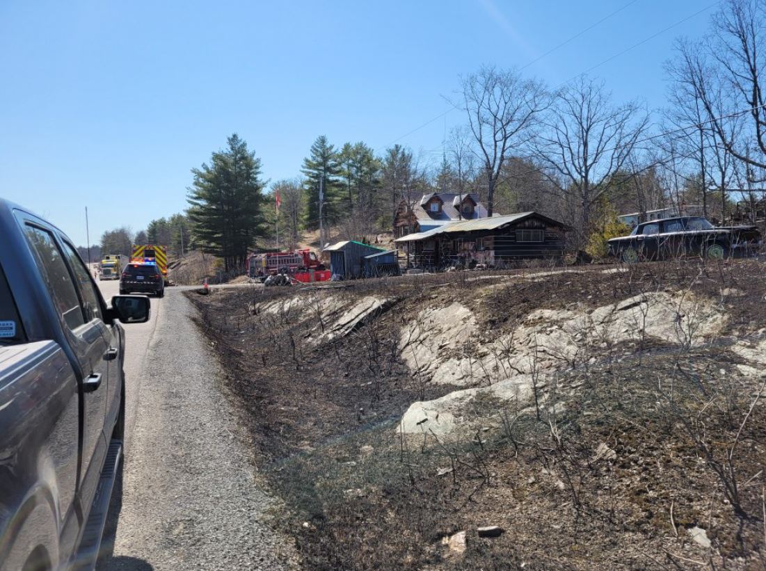 A grass fire broke out after a structure caught fire on Highway 7, just west of Kaladar, Ont.