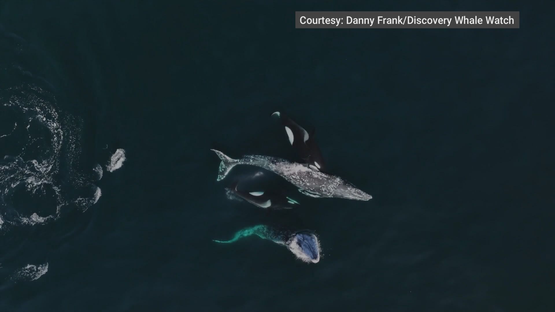 What makes the encounter so rare, Frank added, is that killer whales normally prey on gray whale calves protected by a single mother. In that instance, he said a mother would normally try to hoist the calf up on her belly, out of the water, to keep it out of striking distance.