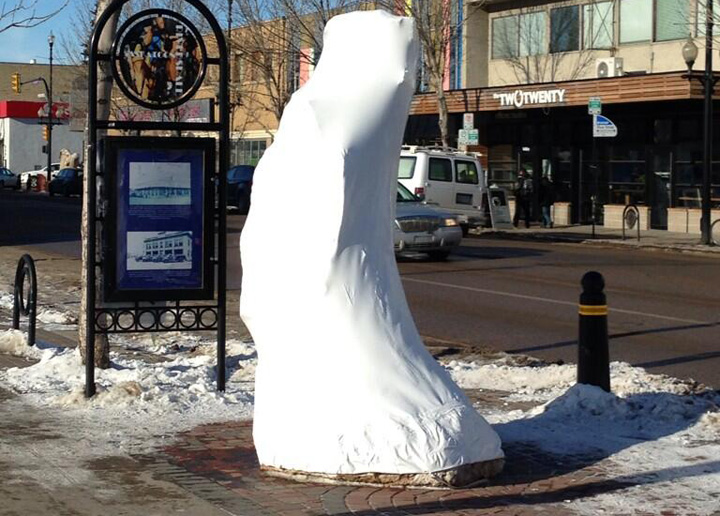 SASKATOON – Some of Saskatoon’s art sculptures are looking a little different this week, covered in white plastic.