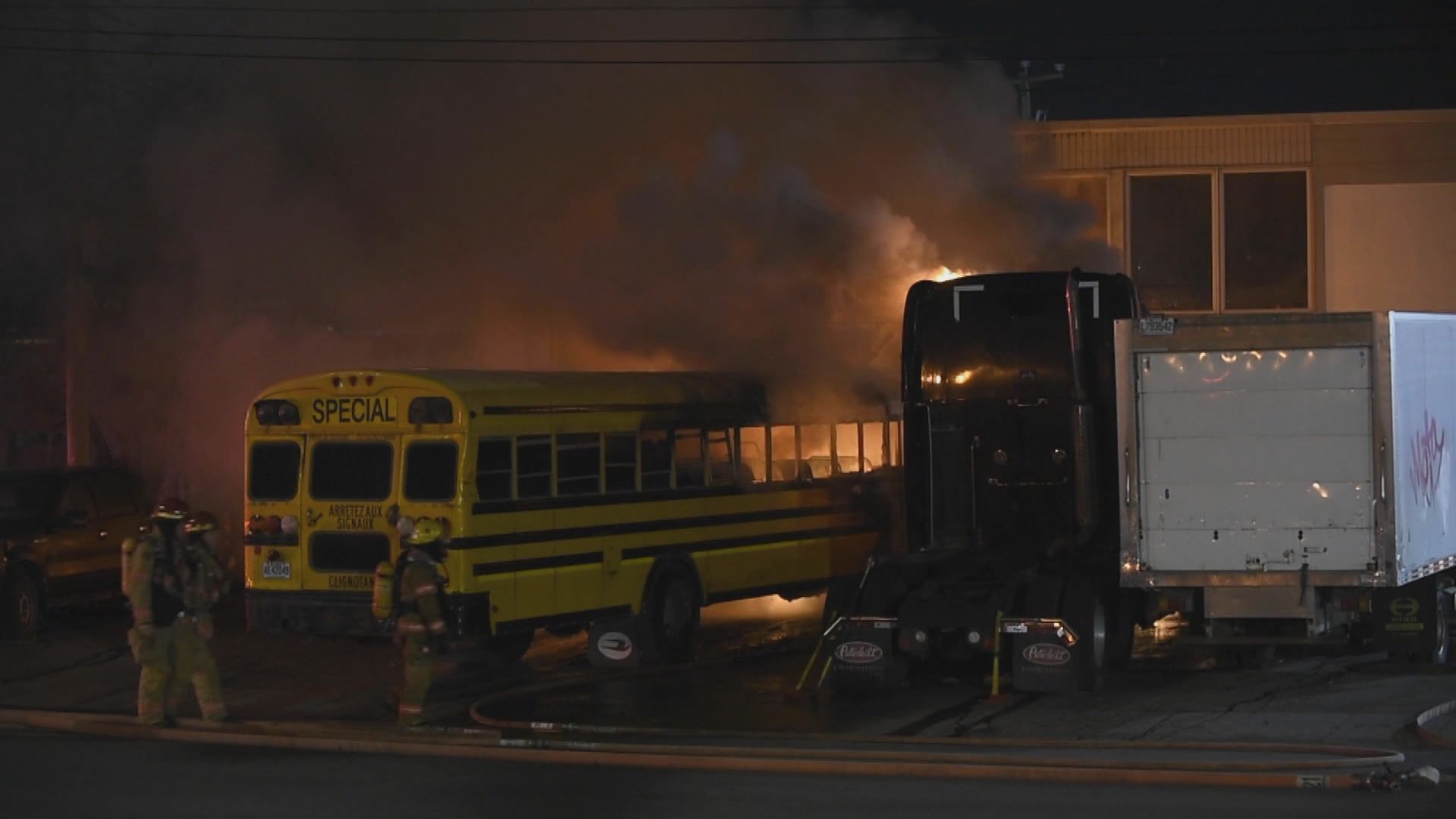 Just before 1 a.m. Wednesday, calls to 911 were made reporting a school bus and a semi-truck on fire in an industrial lot on Malgoire Street near Lafrenaie Street in Saint-Léonard.