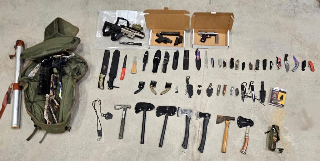 The investigation led officers to seize two loaded firearms, a rifle, multiple edged weapons, a stun gun, illicit drugs and drug paraphernalia.