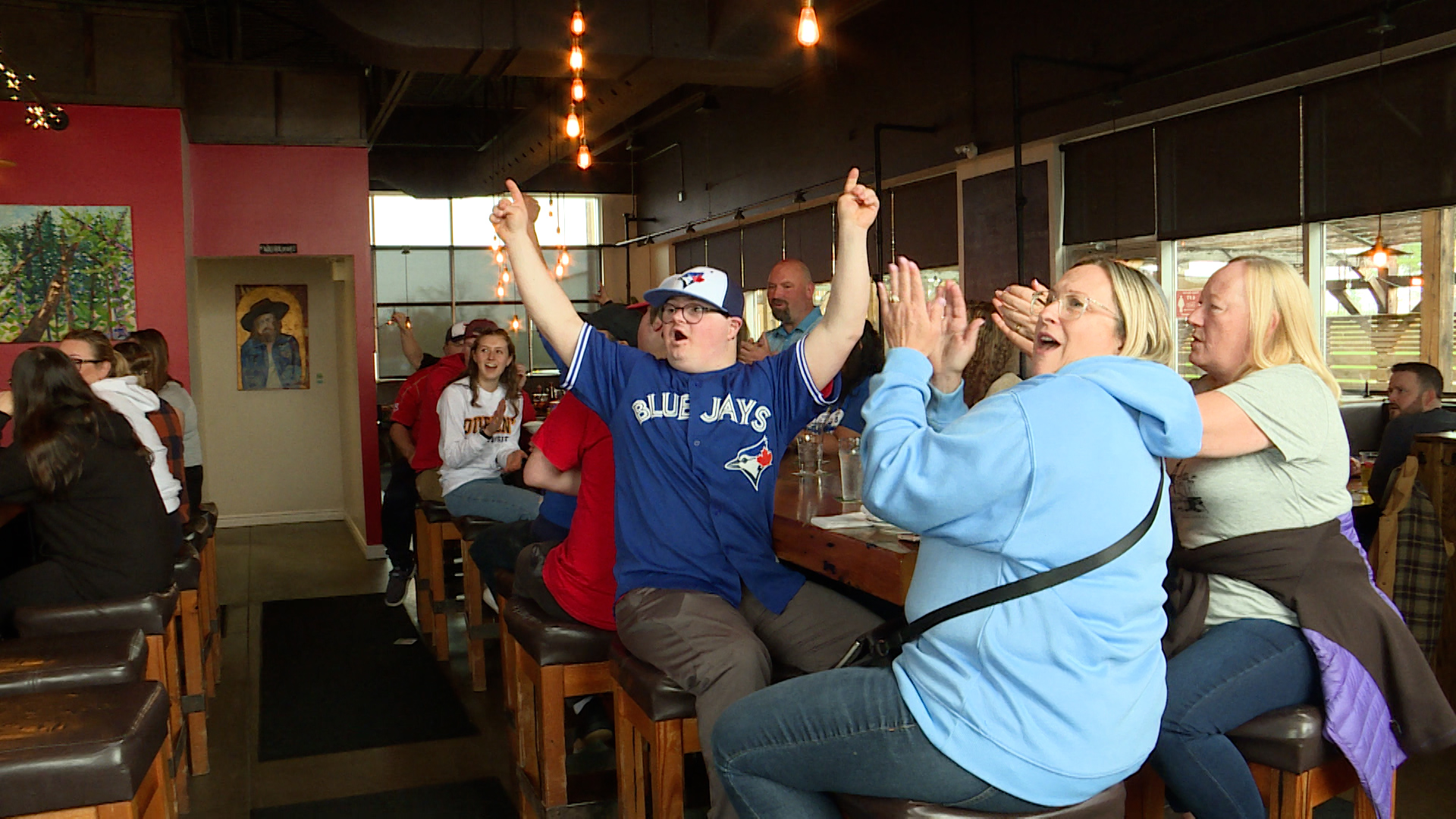 Players, parents and league officials for Kingston Thunder baseball gathered Sunday and cheered when the Toronto Blue Jays came on the TV to battle the Seattle Mariners.