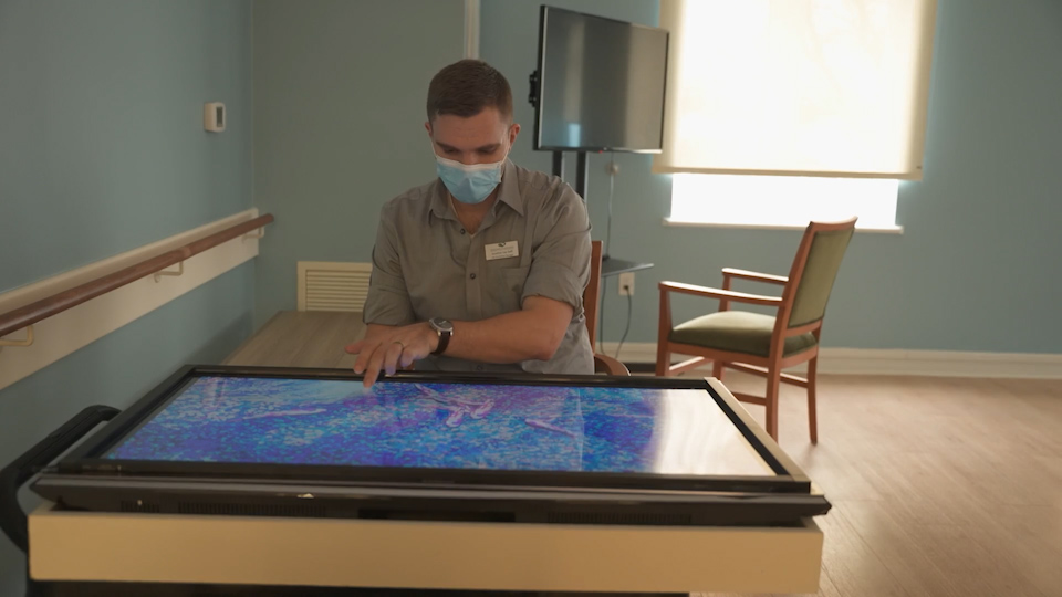 The way it works is that residents will put on a VR headset and be virtually transported to a place where they’re most familiar, like their living room. And within the virtual living room are common features like a TV, photo album and music speaker.