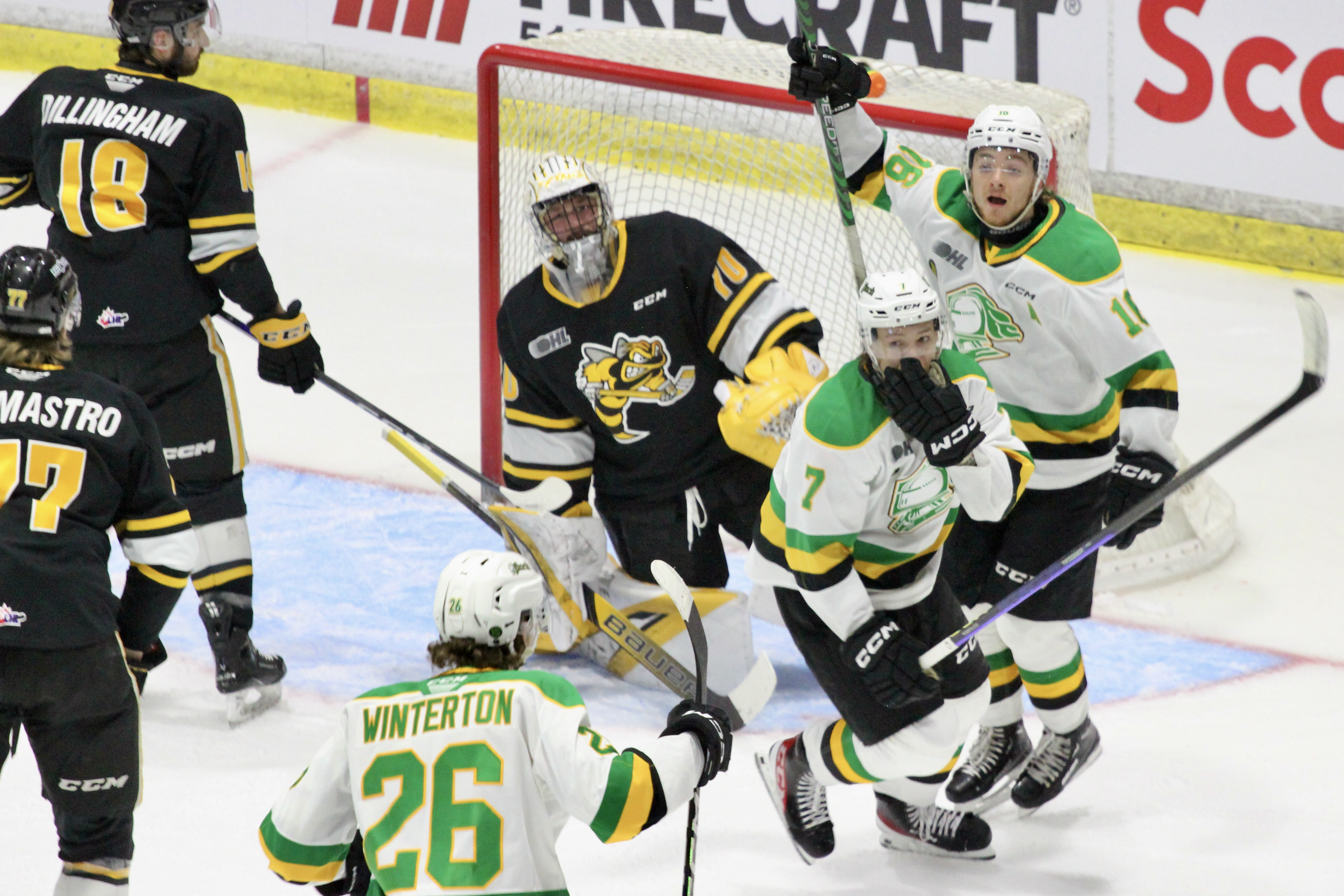 London took a 3-2 lead when Denver Barkey deflected a Logan Mailloux shot into the Sarnia net at 10:57 of the middle frame but the Sting fought back with three straight goals.