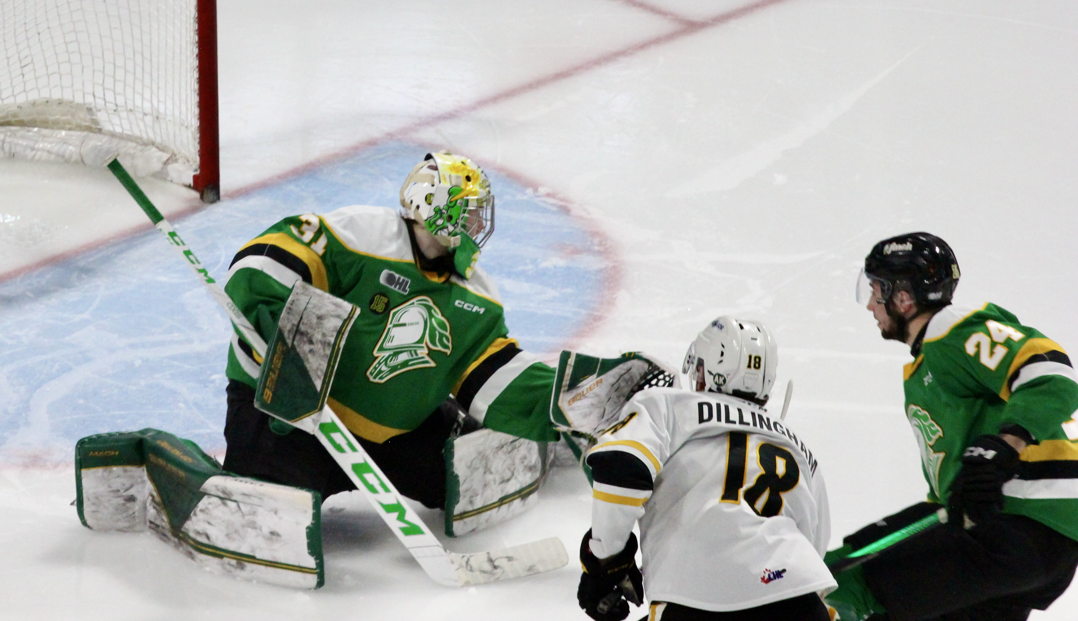 The score stayed that way until the clocked ticked under five minutes remaining and Sarnia head coach Alan Letang called Gadreau to the bench for an extra attacker. The Knights survived in their zone for over a minute until the puck sailed into the Sarnia end and Easton Cowan tied that puck up in the right corner.