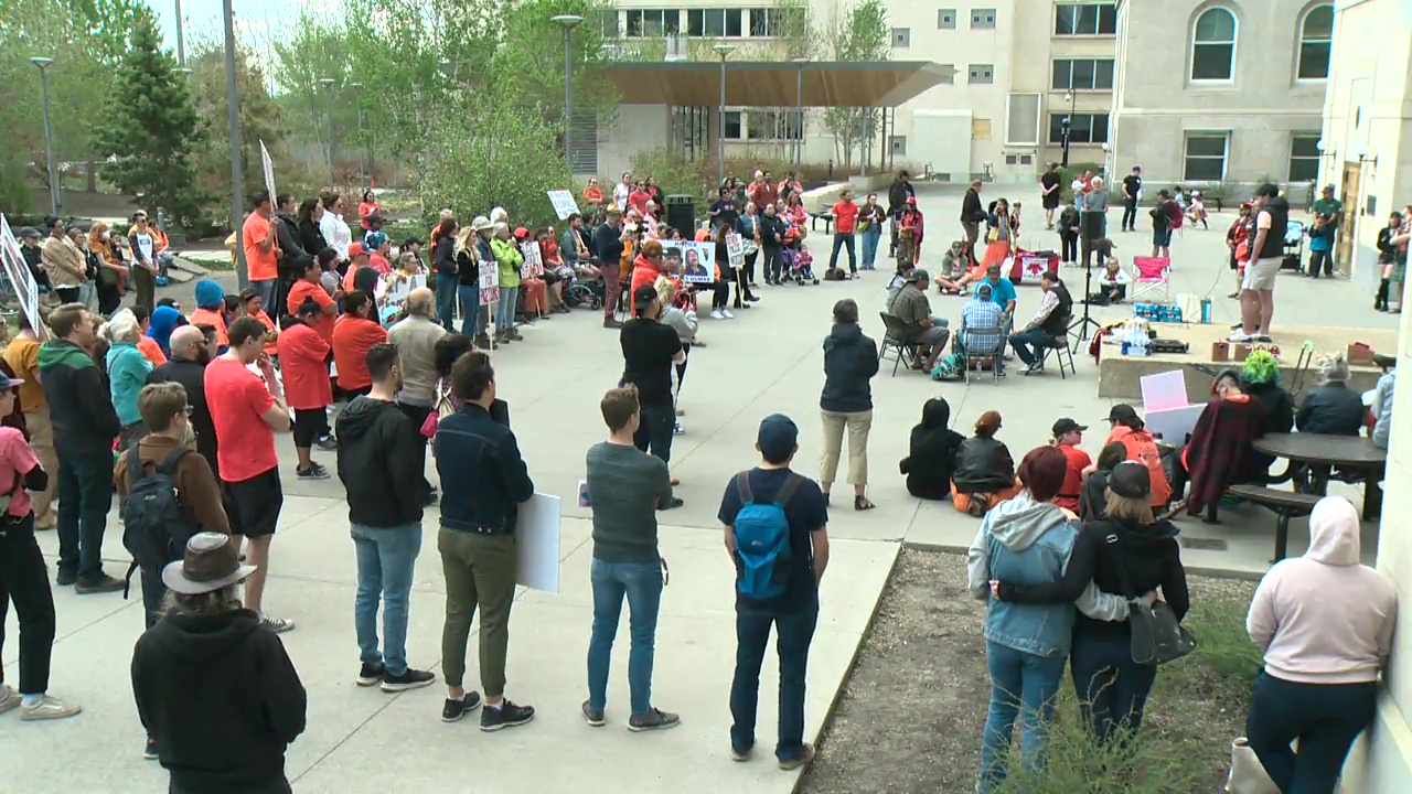 About 100 people gathered in downtown Edmonton Saturday to protest the recent decision by the Alberta Crown Prosecutors Service (ACPS) to not pursue charges against a police officer who left Pacey Dumas, an Indigenous man, with severe injuries during an arrest in 2020.