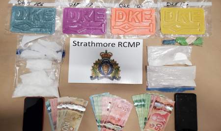 Police seized over one kilogram of drugs during a regular check stop in Strathmore, Alta., March 25.