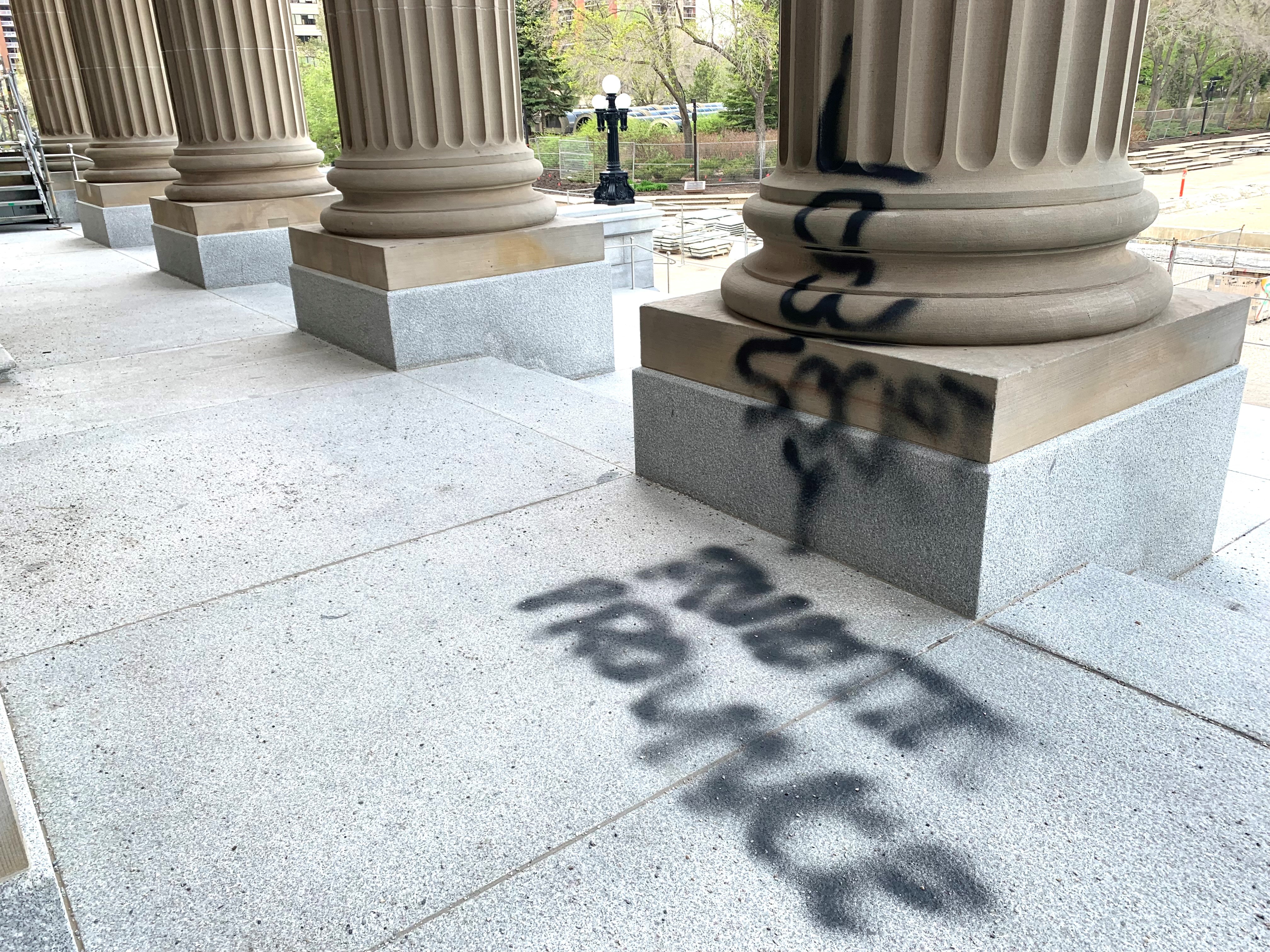 A man was spray painting one of the columns on the north steps of the legislature when he was confronted by construction workers in the area, police said.