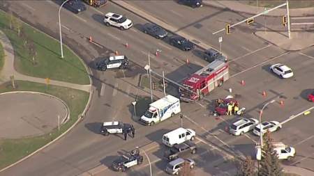 The Global 1 News Helicopter crew captured images of traffic being disrupted at the intersection at around 8:30 a.m. while emergency crews worked at the scene. Shortly after 10:30 a.m., police said 75 Street southbound “is currently shut down while police investigate.”