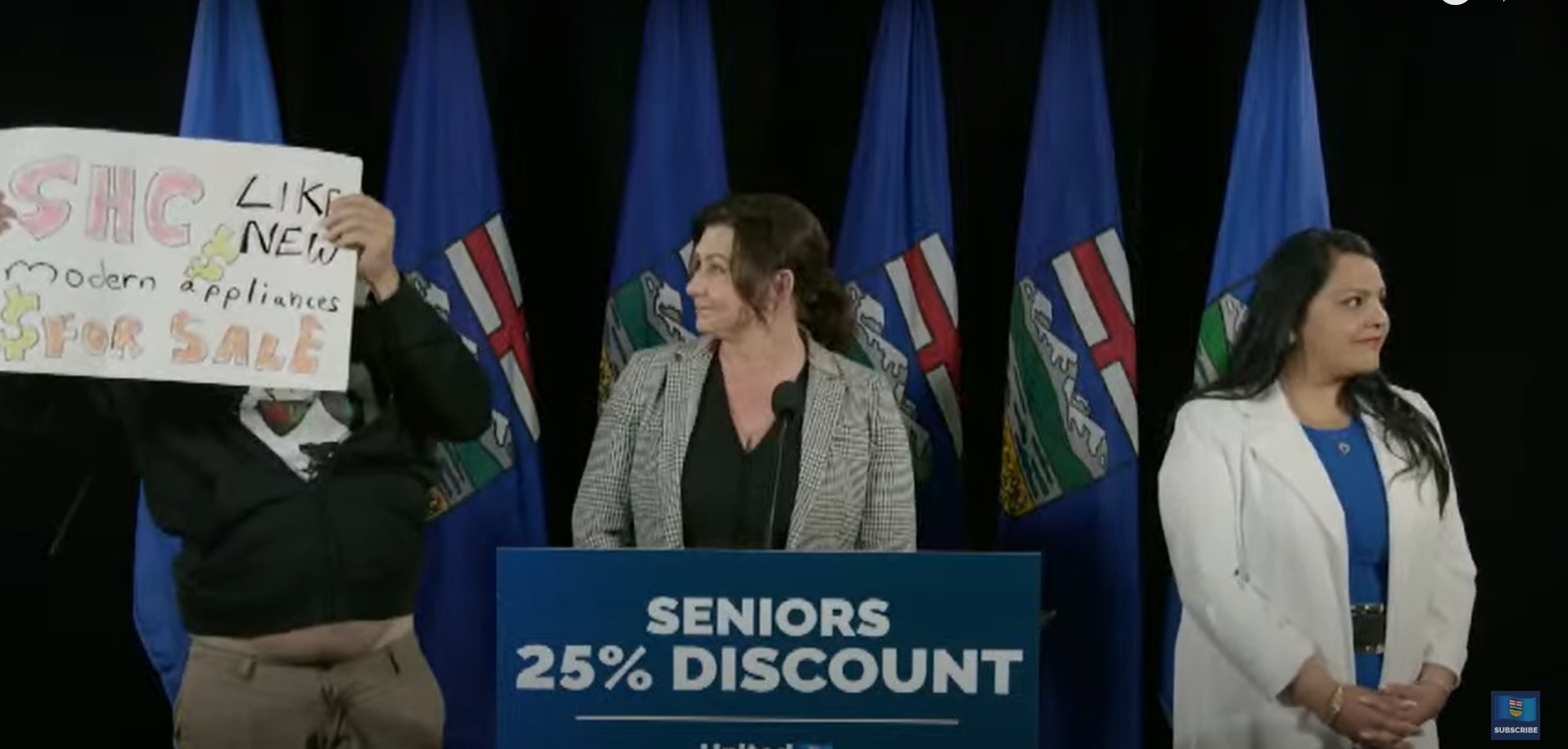 A video stream of the conference from just before noon shows Pamela Rath, candidate for Calgary-Mountain View, speaking at a podium when a man can be heard off-camera saying “Hospitals are not for sale” multiple times.