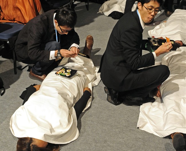 Climate activists following the talks in Warsaw named Japan “fossil of the day,” a dubious honour meant to tag a country blocking progress on combating climate change. Dressed up in dark suits to look like Cabinet ministers, the activists ate sushi over colleagues pretending to be victims of the typhoon that has killed thousands of people in the Philippines.