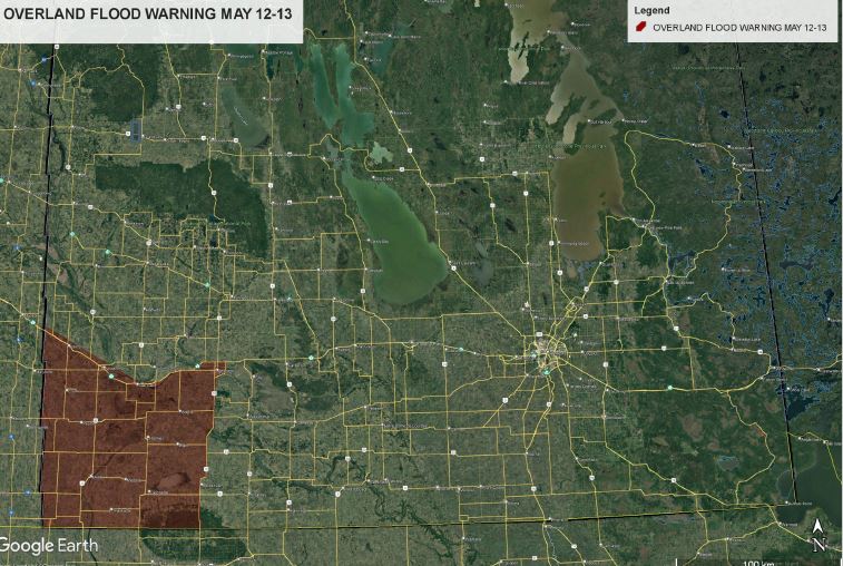 A system that could bring up to 150 millimetres of rain to southwestern Manitoba is leading the province to issue an overland flood warning for the area.