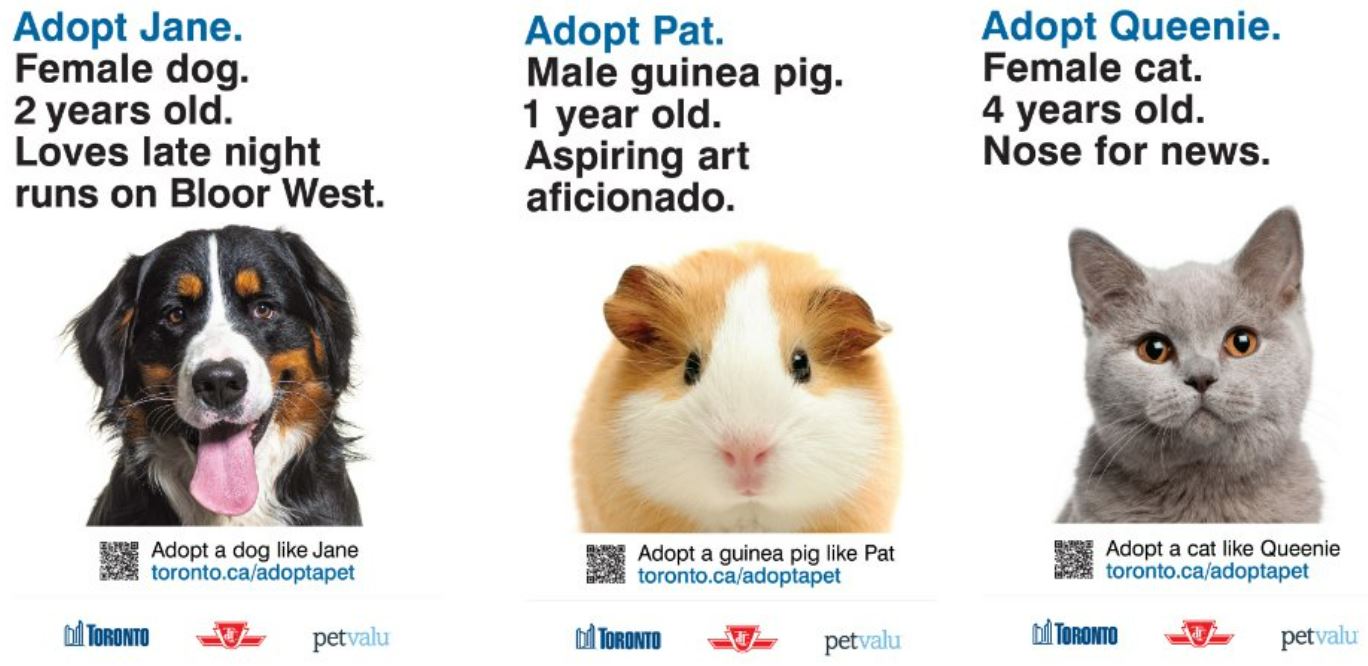 In a joint campaign with the City, Toronto Animal Services, the TTC, and Pet Valu, the images will showcase cats, dogs, guinea pigs and rabbits that are all in need of a new home.