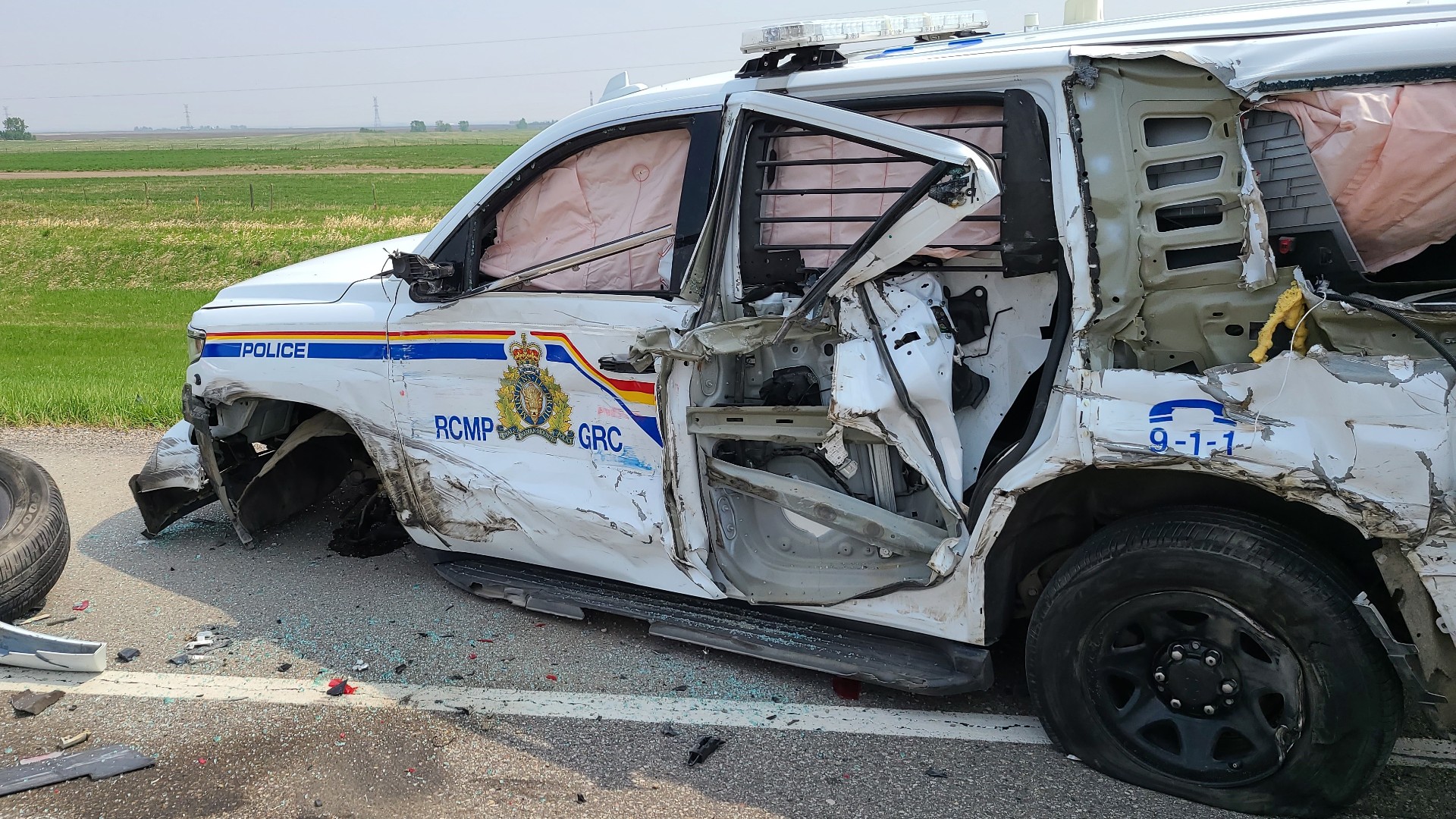 The officer suffered minor injuries from the flying debris from the crash. The RCMP vehicle received significant damage from the collision.