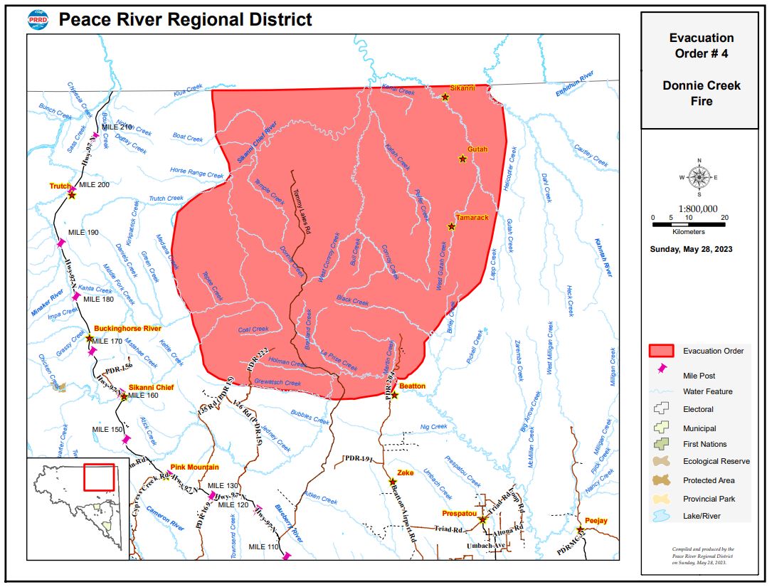 - Extending north-east from a point 1 km east of km 273 on Highway 97 to the confluence of the Buckinghorse River and Medena Creek, then continuing east along the southern boundary of evacuation order #4.