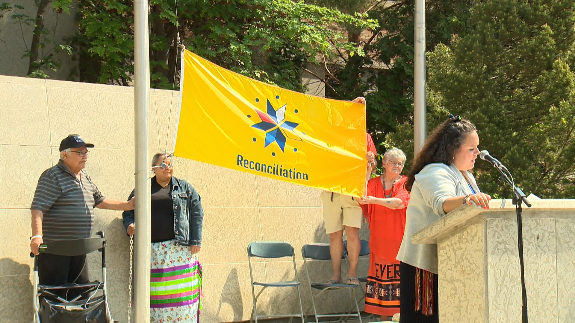 Saskatoon held a flag-raising at Civic Square Monday for the Reconciliation Flag in preparation for National Indigenous History Month and National Indigenous Peoples Day.