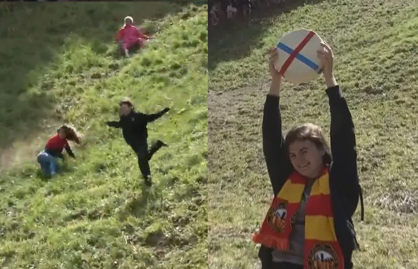 The annual contest sees scores of risk-takers hurl themselves down a 45-degree slope chasing a three-kilogram hubcap-sized wheel of Double Gloucester cheese. The first to the bottom wins the cheese and the right to call themselves champion.