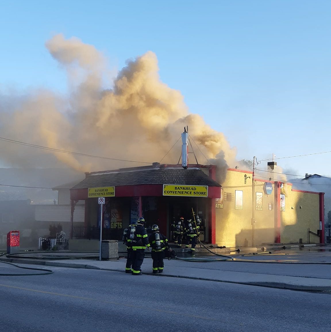Emergency crews responded to the Bankhead Store in Kelowna, B.C., after it went up in flames Sunday morning.
