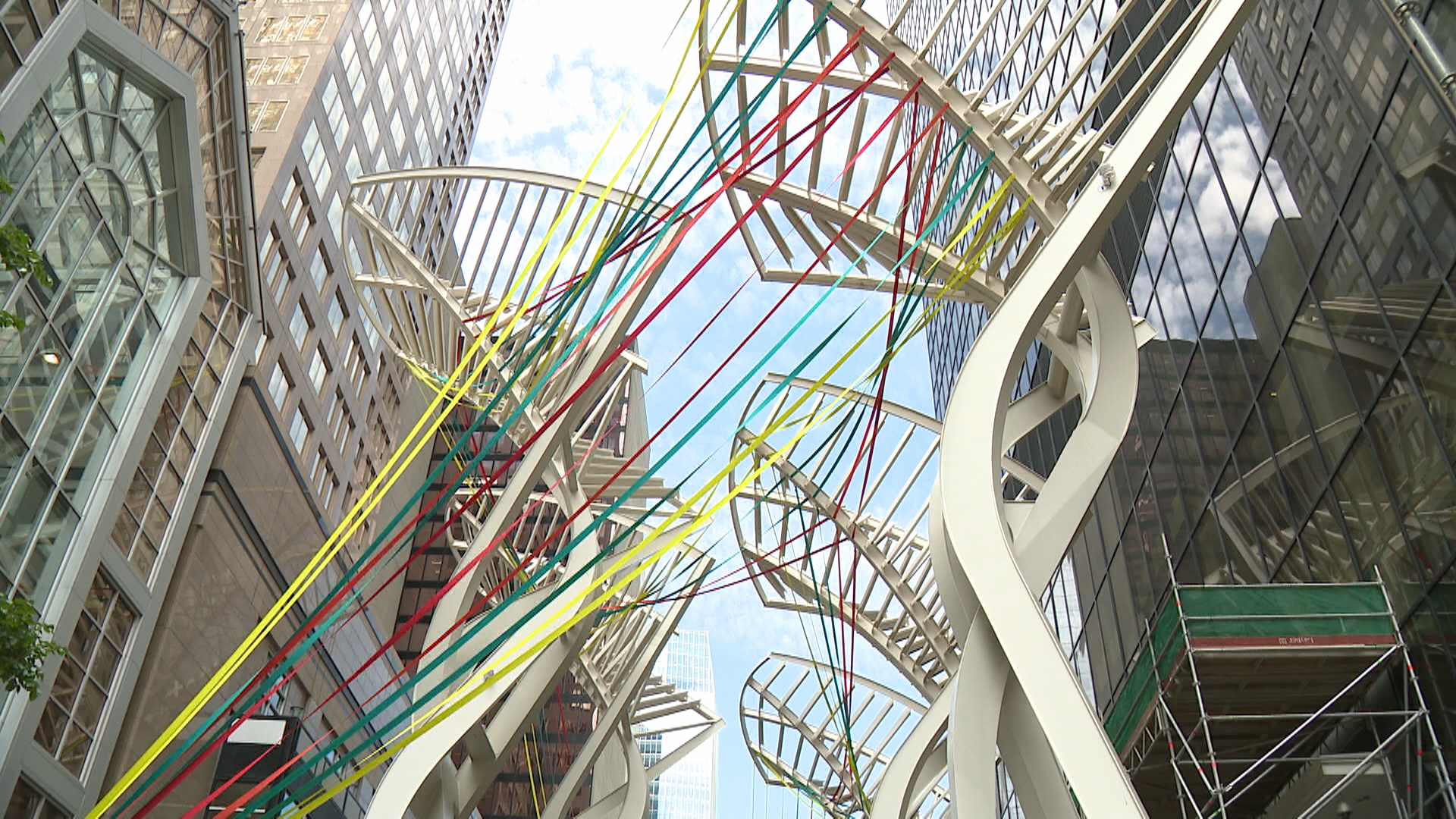 Ribbons of red, orange, green and yellow have transformed an iconic downtown Calgary art installation into a colourful representation of the city’s urban fabric.