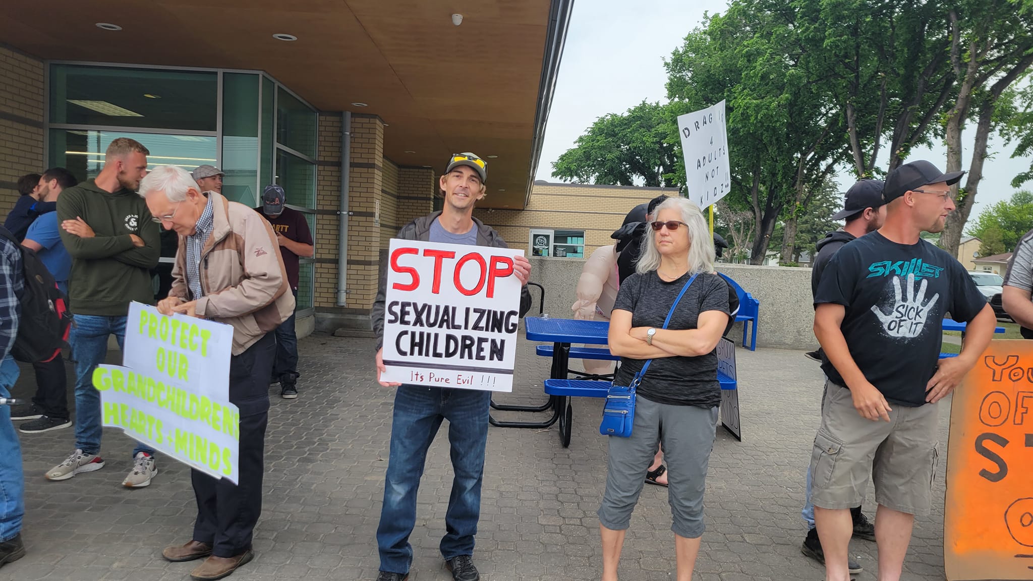 Protesters lined the street around the Taber Public Library in Taber, Alta., as promised Saturday morning, concerned about a drag performer reading books to an audience with kids in attendance.