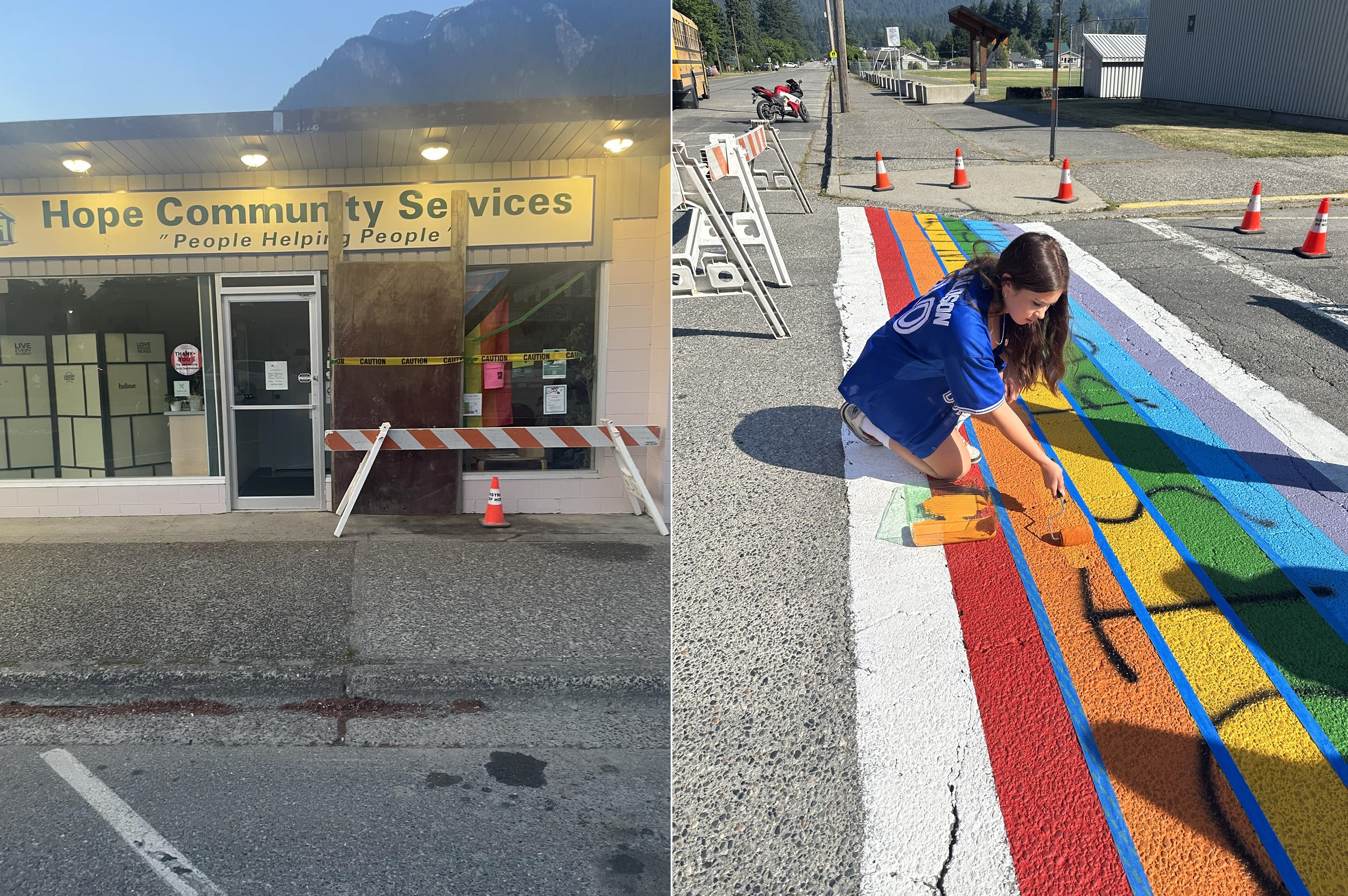 Firefighters were called to the Hope Community Services head office around 3 a.m. Thursday, where someone had smashed in the front window and set a fire trying to burn a Pride flag hanging prominently inside, Upper Fraser RCMP said.