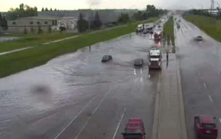 A City of Calgary traffic camera showed a car that appeared to be partially submerged at Glenmore Trail and 52nd Street S.E. First responders managed to push the vehicle out of the flooded roadway.