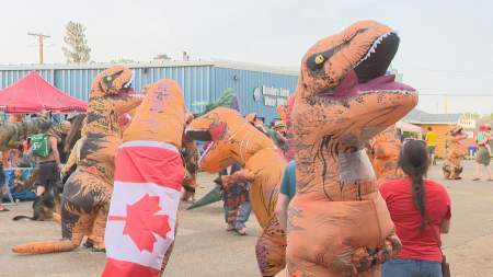 With a fun and a different way to celebrate Canada Day, Dundurn aimed to break the current world record of 380 inflatable dinosaurs. With over 1,163 people dressed in inflatable dinosaur costumes, it isn’t official, but the town and out-of-town guests celebrated the win.
